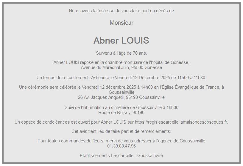 Cet espace « condoléances » est dédié à la mémoire de Monsieur Abner LOUIS.
