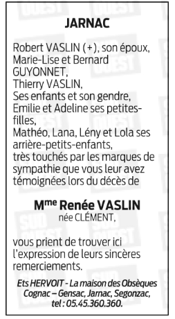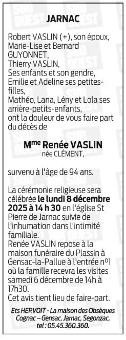 Cet espace « condoléances » est dédié à la mémoire de Madame Renée VASLIN née CLÉMENT.
