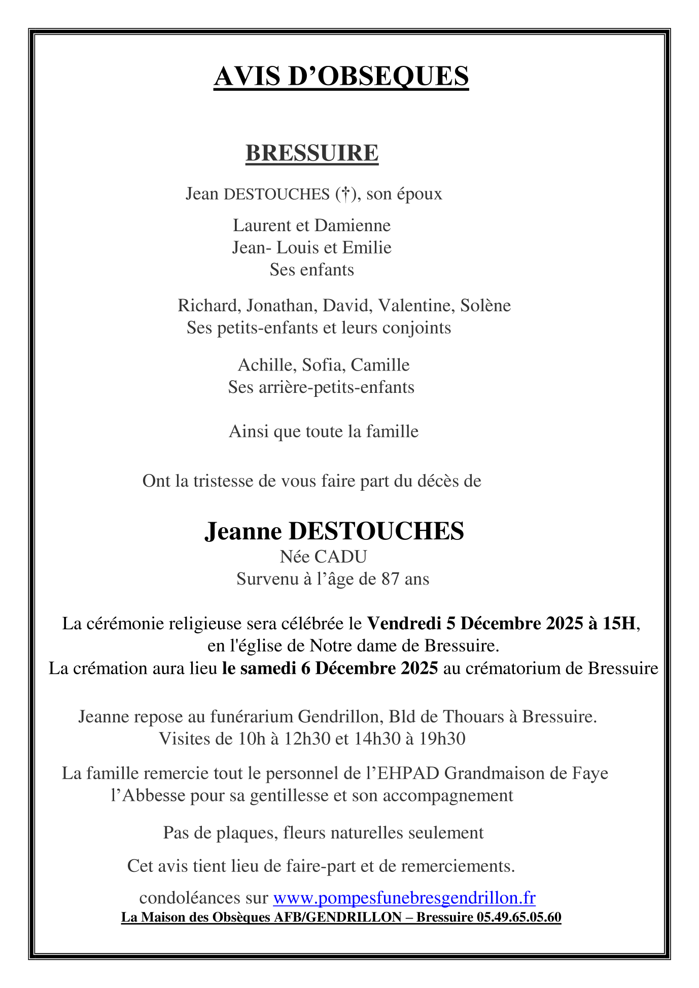 Cet espace « condoléances » est dédié à la mémoire de Madame Jeanne DESTOUCHES née CADU.