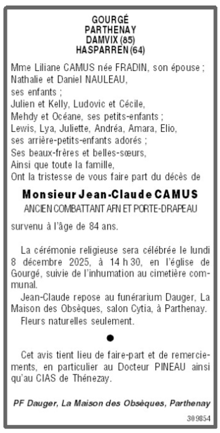 Cet espace « condoléances » est dédié à la mémoire de Monsieur Jean-Claude CAMUS.