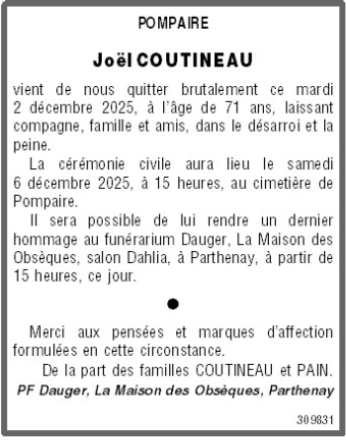 Cet espace « condoléances » est dédié à la mémoire de Monsieur Joël COUTINEAU.