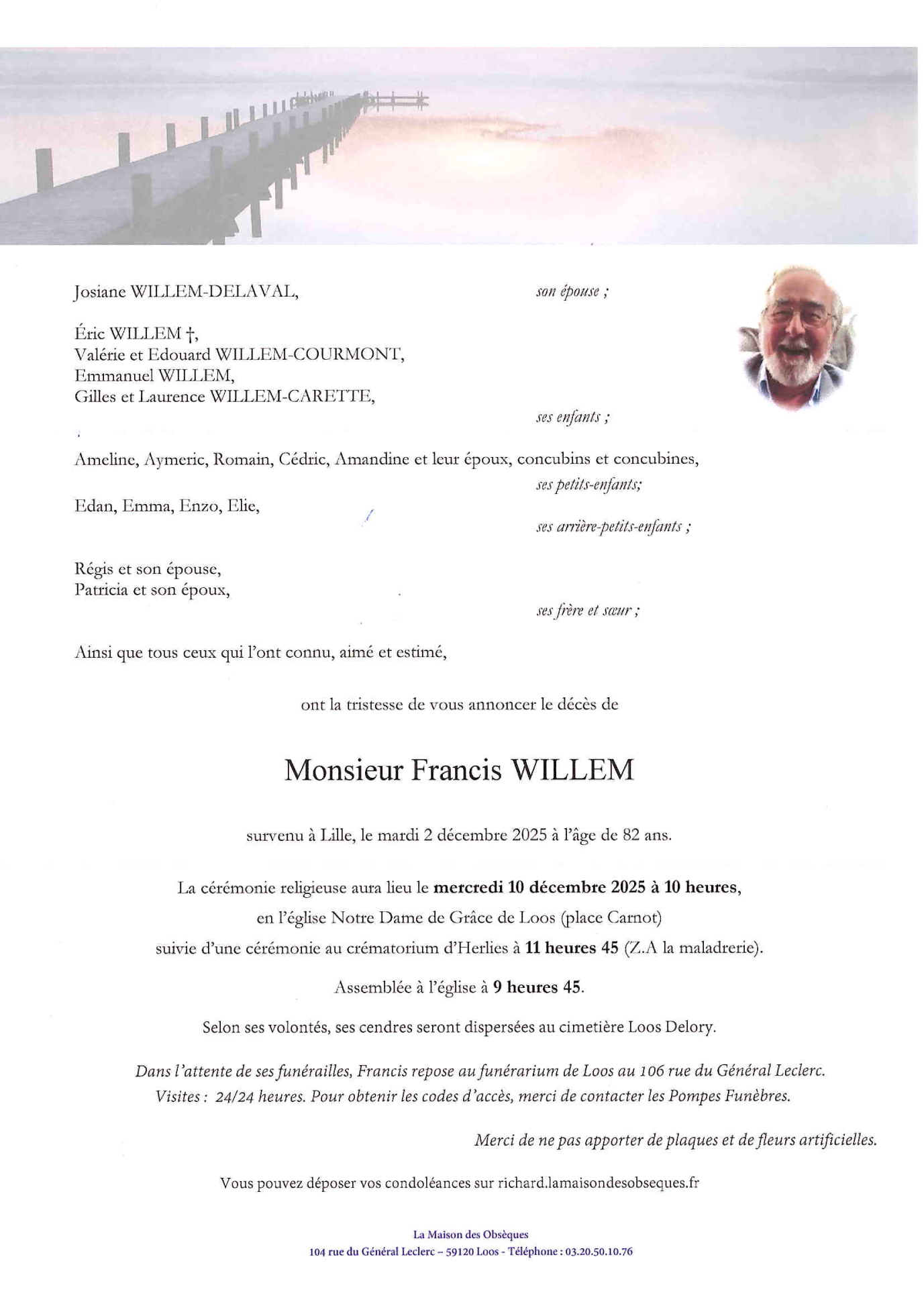 Cet espace « condoléances » est dédié à la mémoire de Monsieur Francis WILLEM.