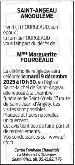 Cet espace « condoléances » est dédié à la mémoire de Madame MARGUERITE FOURGEAUD née BOUCHAUD.
