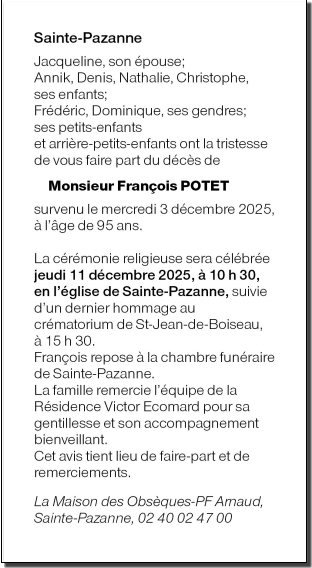 Décédé à Sainte-Pazanne (44680) le mercredi 3 décembre 2025
