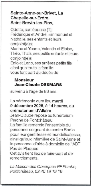 Décédé à Pontchâteau (44160) le jeudi 4 décembre 2025