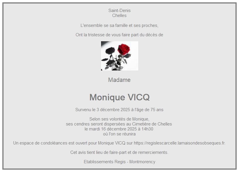 Cet espace « condoléances » est dédié à la mémoire de Madame Monique VICQ.