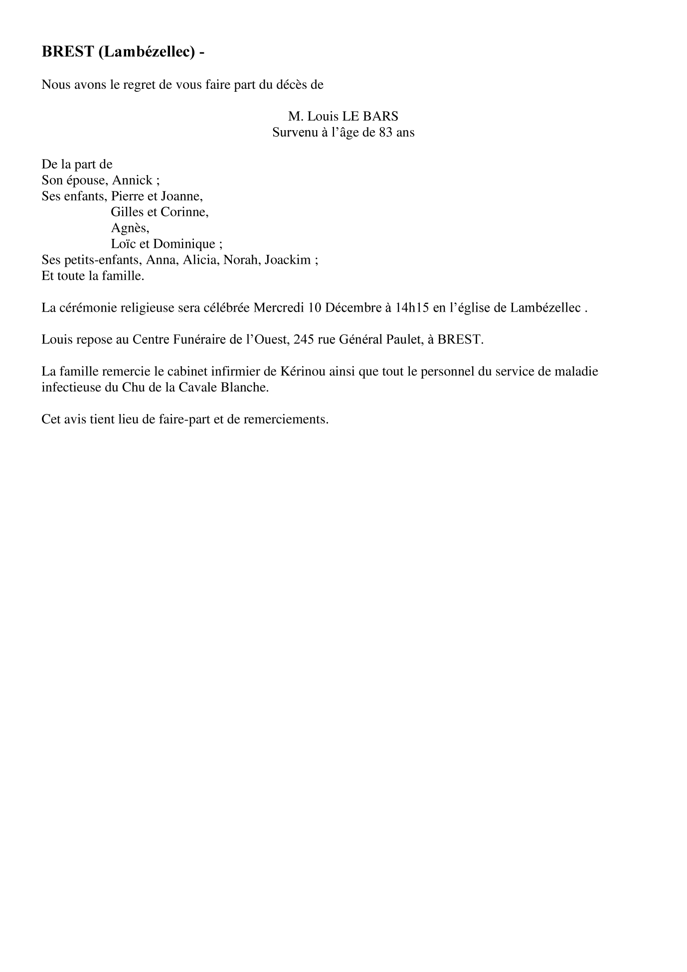 Cet espace « condoléances » est dédié à la mémoire de Monsieur Louis LE BARS.
