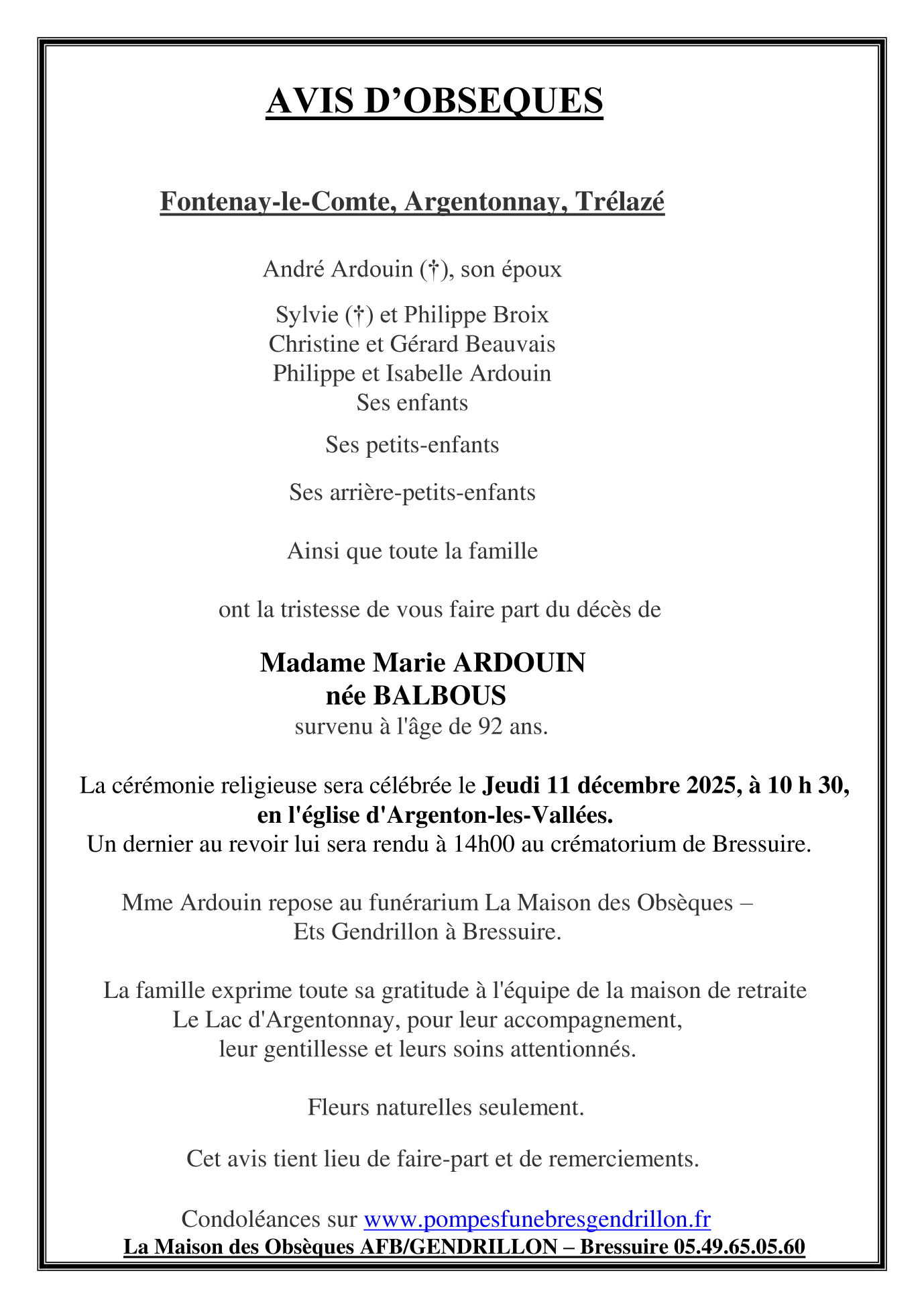 de Madame Marie ARDOUIN née BALBOUS