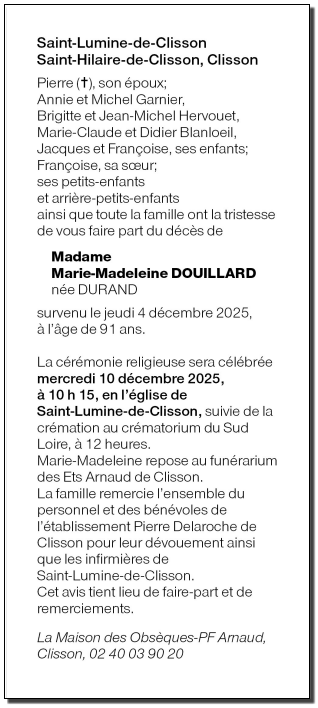Cet espace « condoléances » est dédié à la mémoire de Madame Marie-Madeleine DOUILLARD née DURAND.