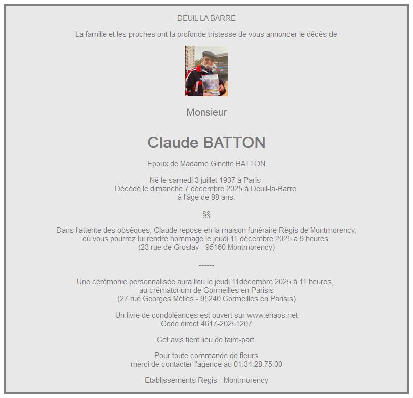 Nous avons appris avec une grande tristesse le départ de Mr Claude Batton. En ces moments douloureux, nous tenons à exprimer à Mme Ginette Batton, Agnès et Delphine toute notre affection et nos sincères condoléances. Que le souvenir de Mr Claude Batton vous apporte réconfort et paix.