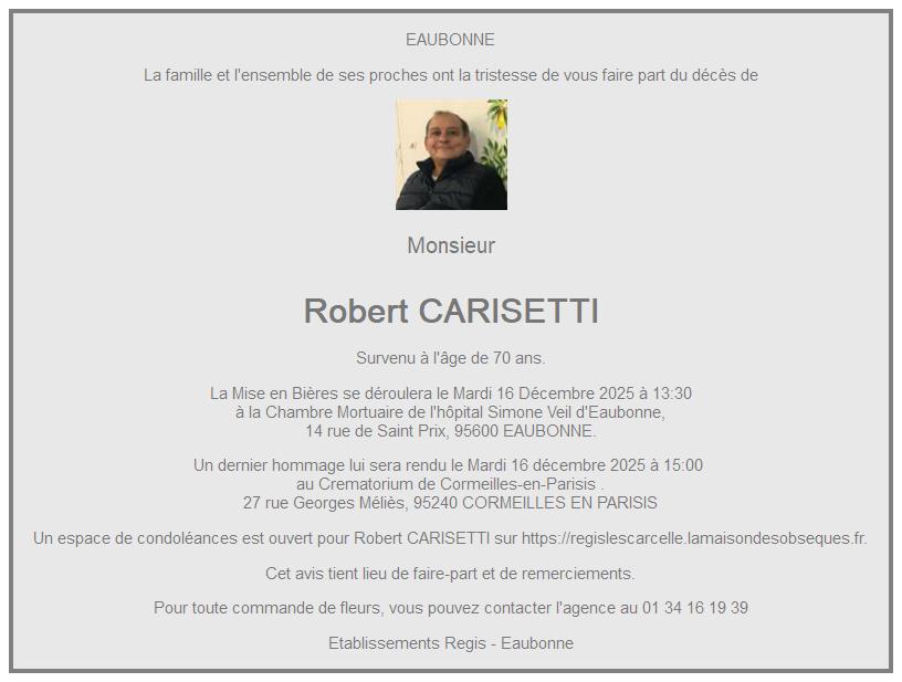 Cet espace « condoléances » est dédié à la mémoire de Monsieur Robert CARISETTI.