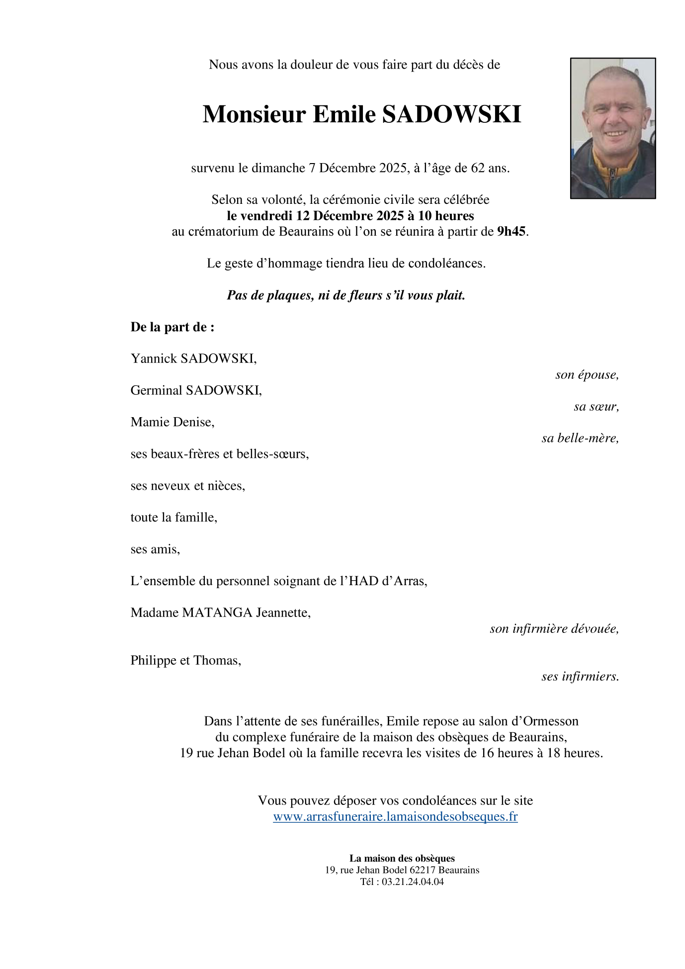 Cet espace « condoléances » est dédié à la mémoire de Monsieur Emile SADOWSKI.