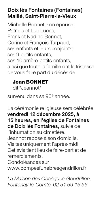 Décédé à Fontaines (85200) le lundi 8 décembre 2025