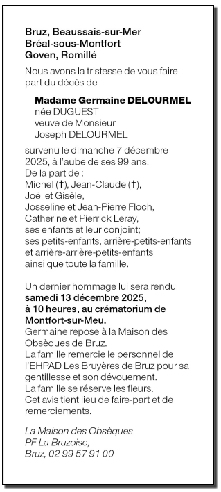 Cet espace « condoléances » est dédié à la mémoire de Madame Germaine DELOURMEL née DUGUEST.