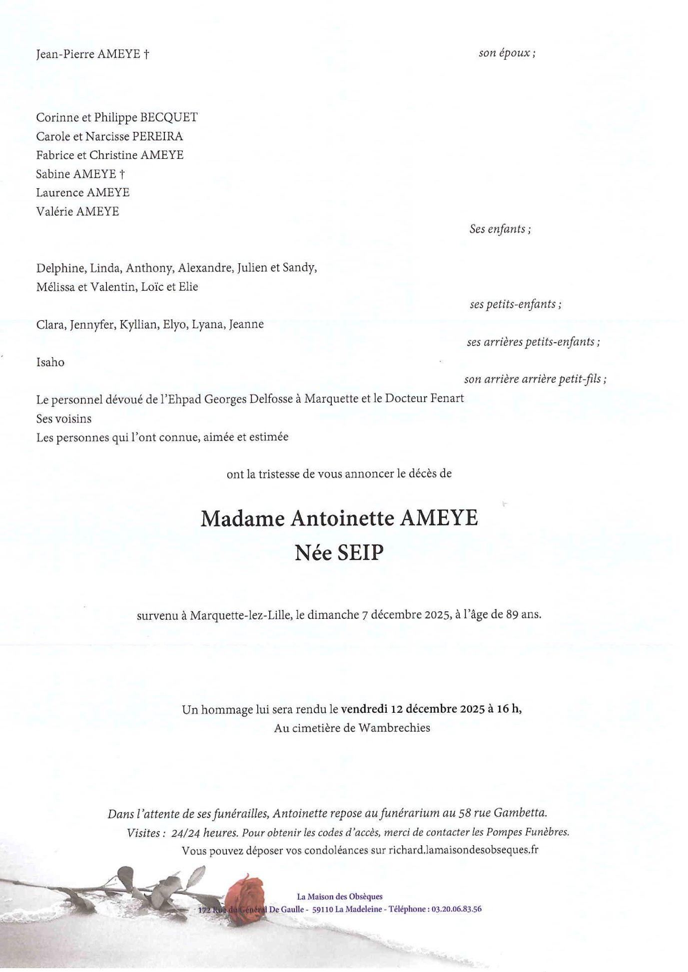 Cet espace « condoléances » est dédié à la mémoire de Madame Antoinette SEIP.