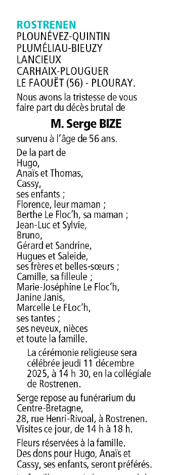 Décédé à Carhaix-Plouguer (29270) le lundi 8 décembre 2025