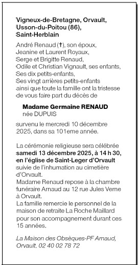 Cet espace « condoléances » est dédié à la mémoire de Madame Germaine RENAUD née DUPUIS.