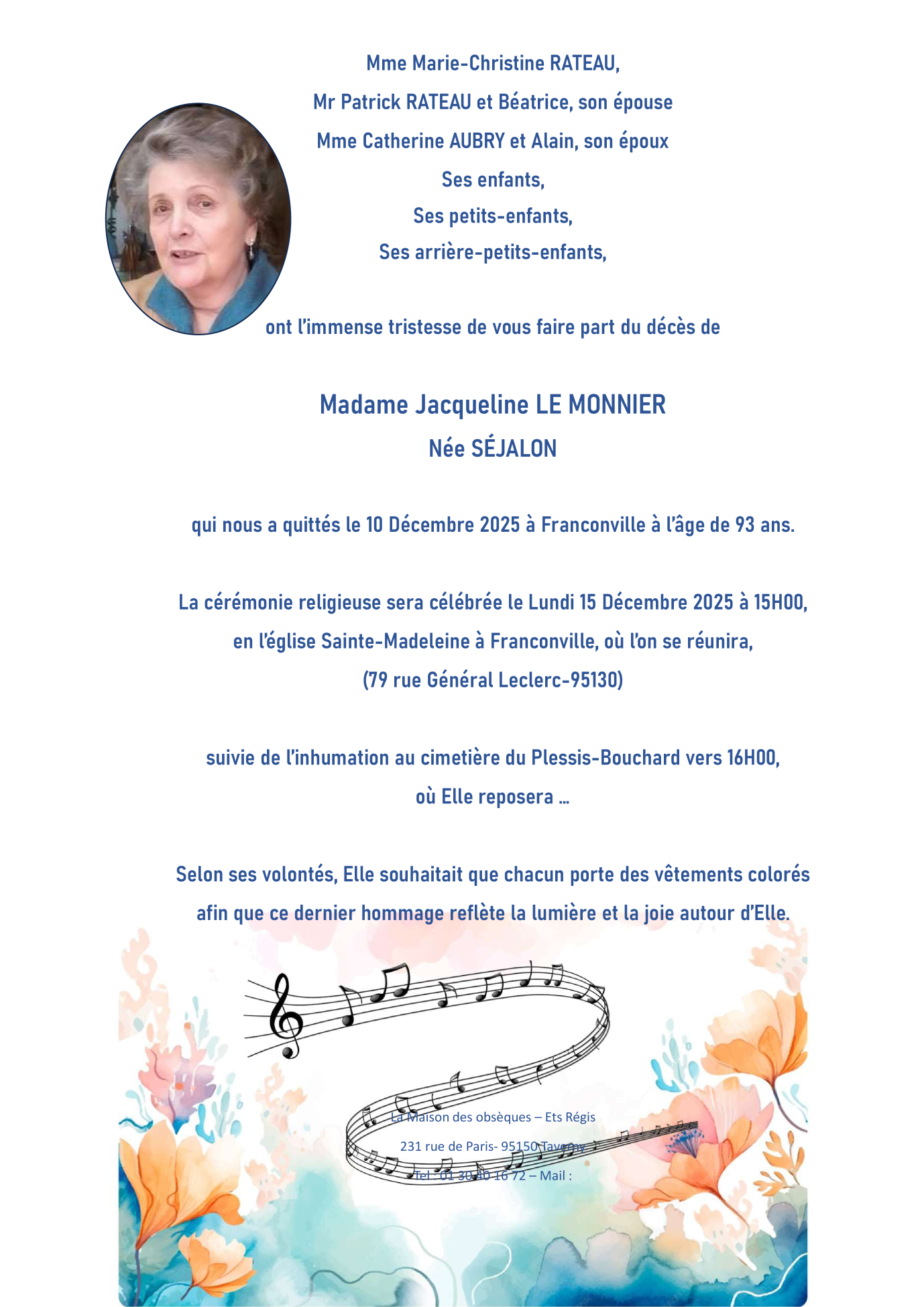 Cet espace « condoléances » est dédié à la mémoire de Madame Jacqueline LE MONNIER née SEJALON.