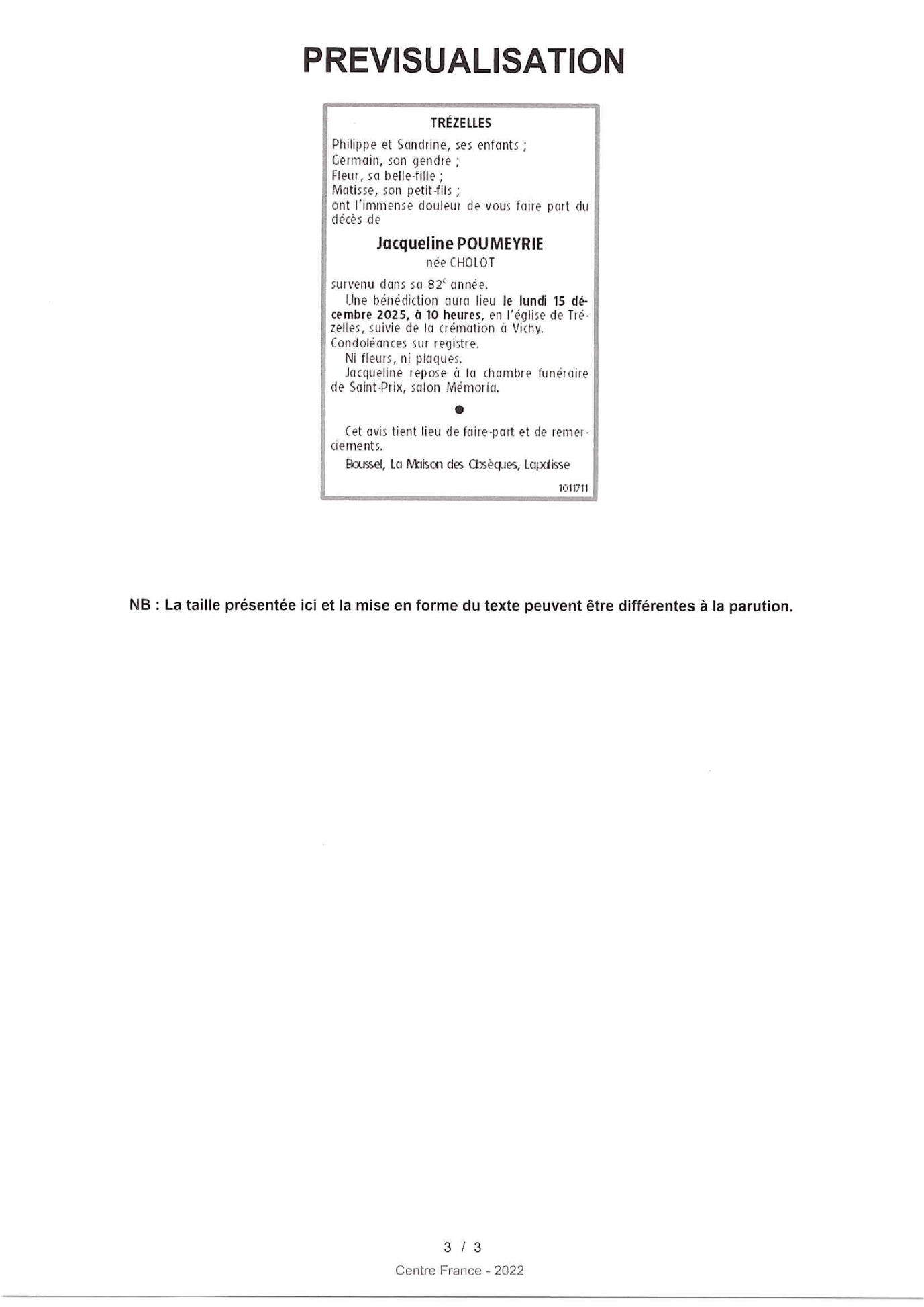 de Madame Jacqueline POUMEYRIE née CHOLOT