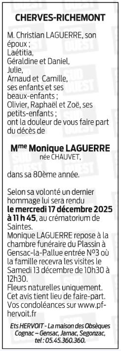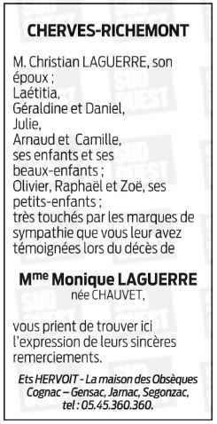 Cet espace « condoléances » est dédié à la mémoire de Madame Monique LAGUERRE née CHAUVET.