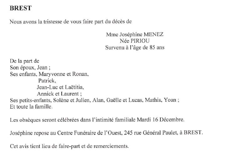 de Madame Joséphine MÉNEZ née PIRIOU