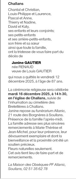 Cet espace « condoléances » est dédié à la mémoire de Madame Janine GAUTIER née RENAUD.
