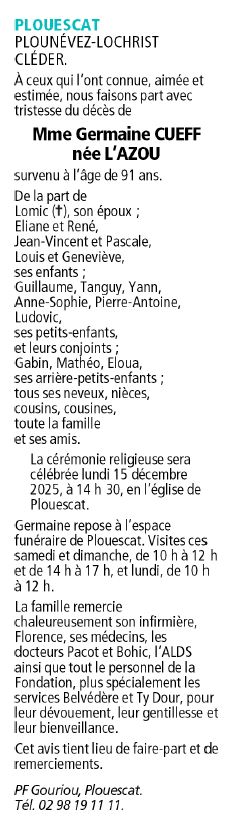 Cet espace « condoléances » est dédié à la mémoire de Madame Germaine CUEFF née L'AZOU.