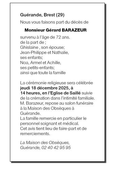 Cet espace « condoléances » est dédié à la mémoire de Monsieur Gérard BARAZEUR.
