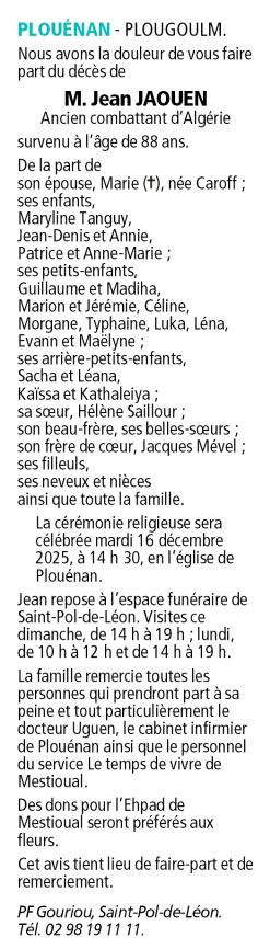 Décédé à Cléder (29233) le samedi 13 décembre 2025