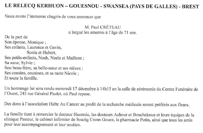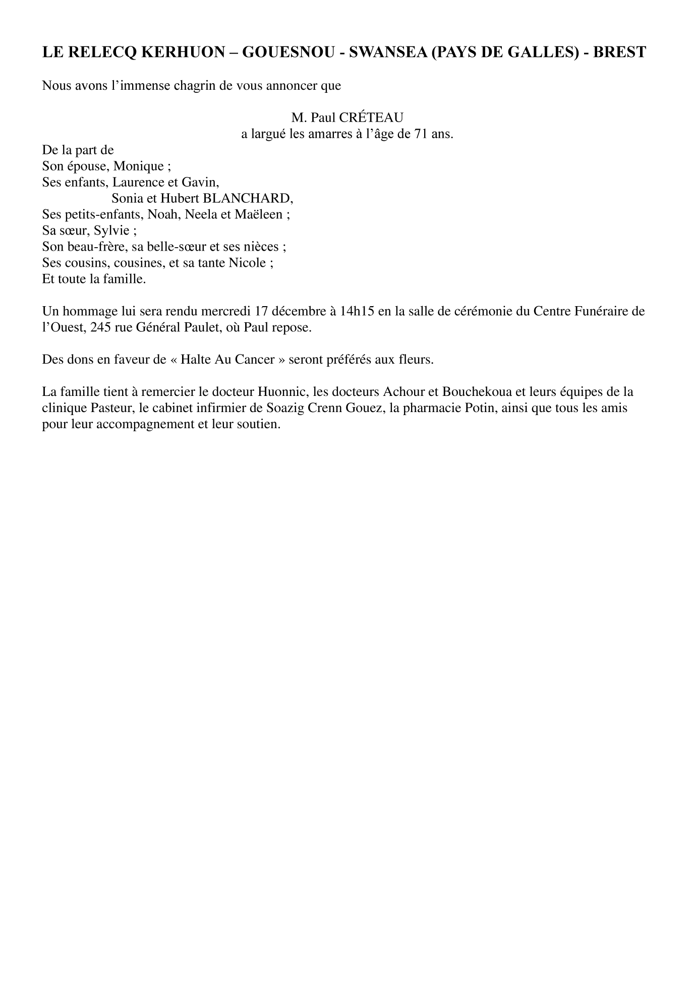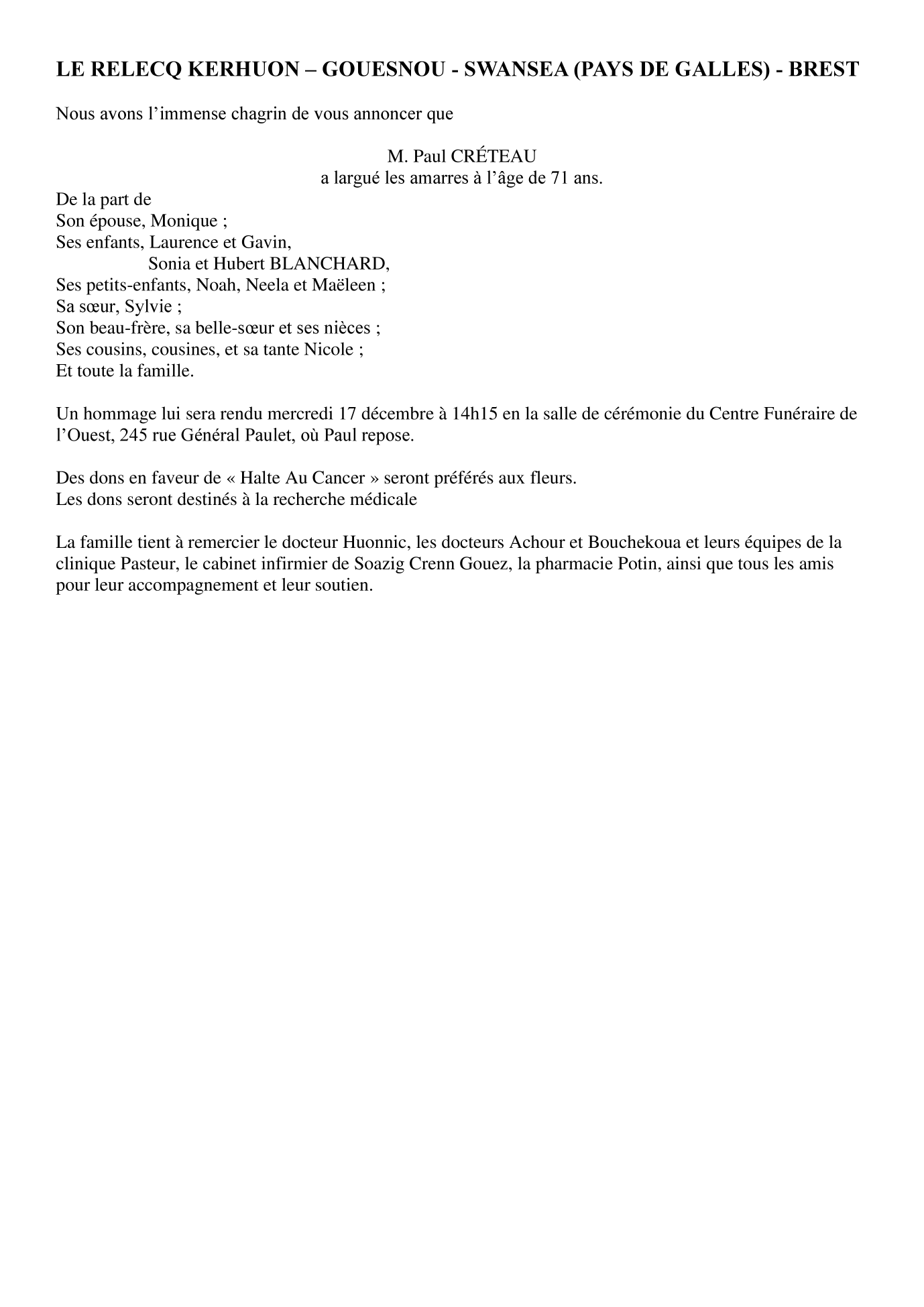 Cet espace « condoléances » est dédié à la mémoire de Monsieur Paul CRÉTEAU.