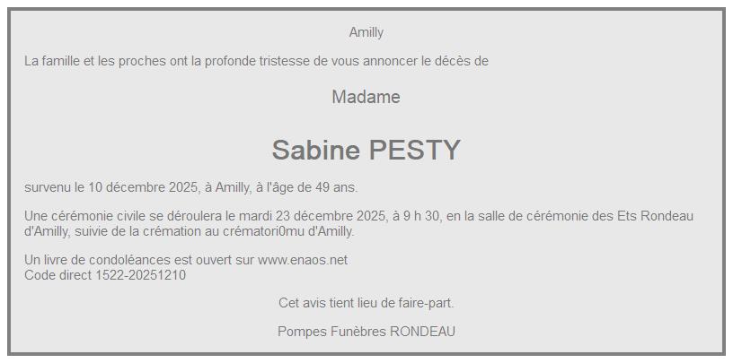 Cet espace « condoléances » est dédié à la mémoire de Madame Sabine PESTY.