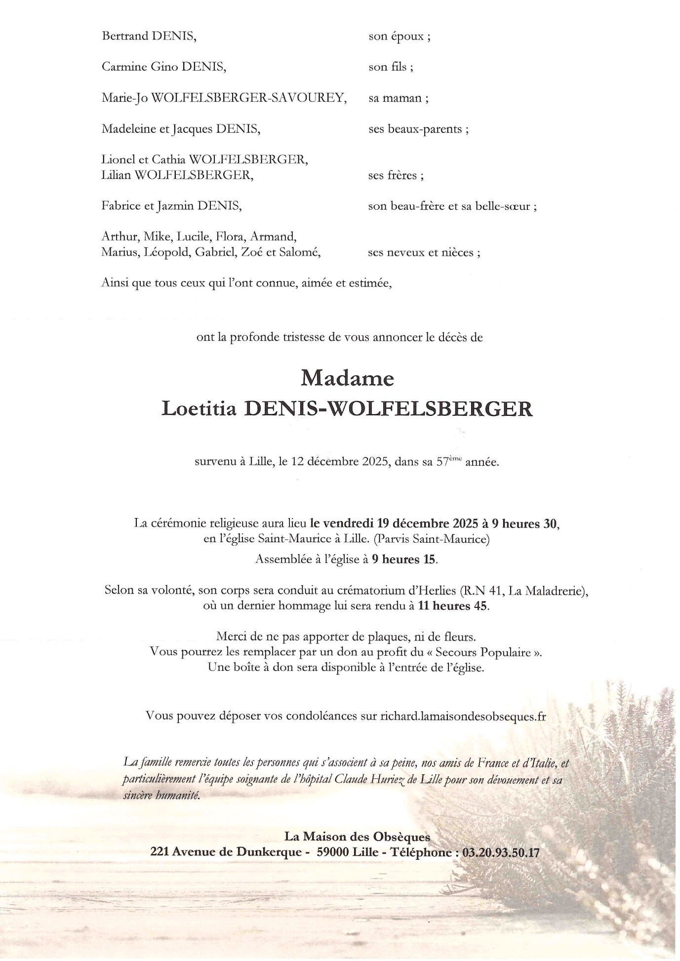 Cet espace « condoléances » est dédié à la mémoire de Madame Loetitia DENIS née WOLFELSBERGER.