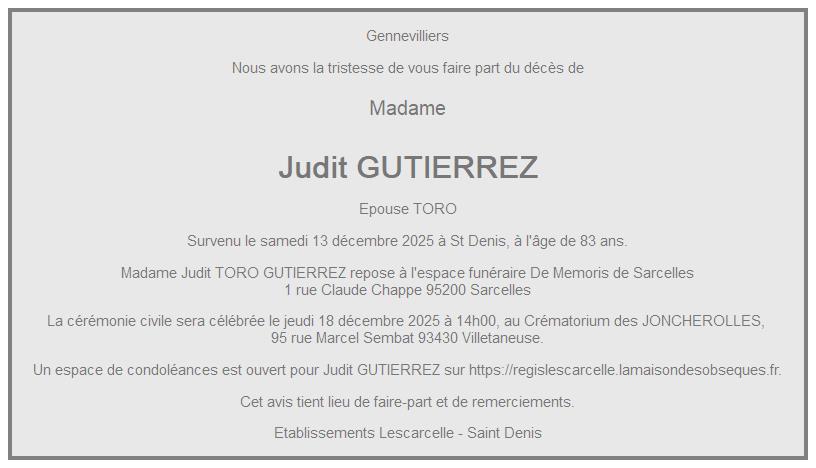 Cet espace « condoléances » est dédié à la mémoire de Madame Judit TORO née GUTIERREZ.