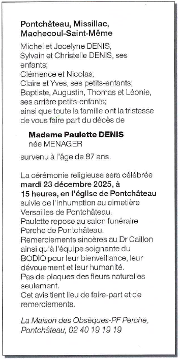Décédée à Pontchâteau (44160) le dimanche 14 décembre 2025