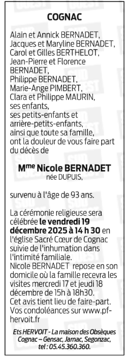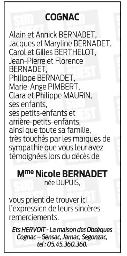 Cet espace « condoléances » est dédié à la mémoire de Madame Nicole BERNADET née DUPUIS.