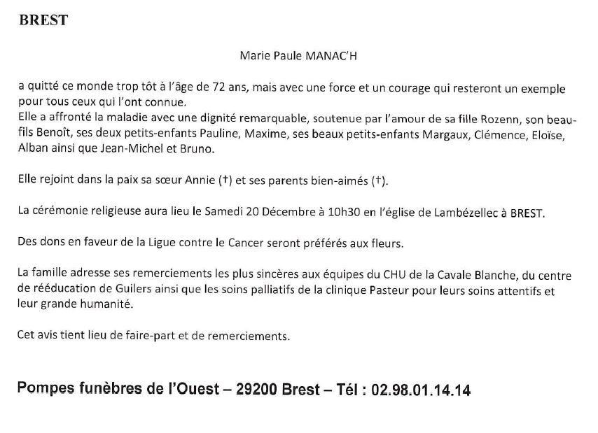 Cet espace « condoléances » est dédié à la mémoire de Madame Marie-Paule MANAC'H.