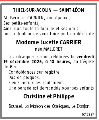 Cet espace « condoléances » est dédié à la mémoire de Madame Lucette CARRIER née MALLERET.