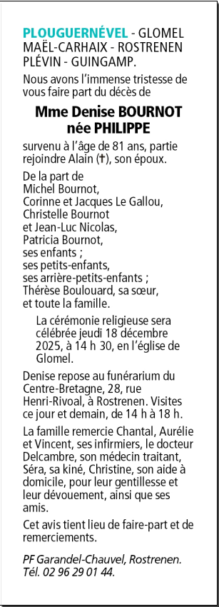 Décédée à Plouguernevel (22110) le dimanche 14 décembre 2025