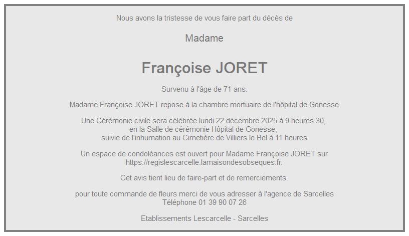 Cet espace « condoléances » est dédié à la mémoire de Madame Françoise JORET.