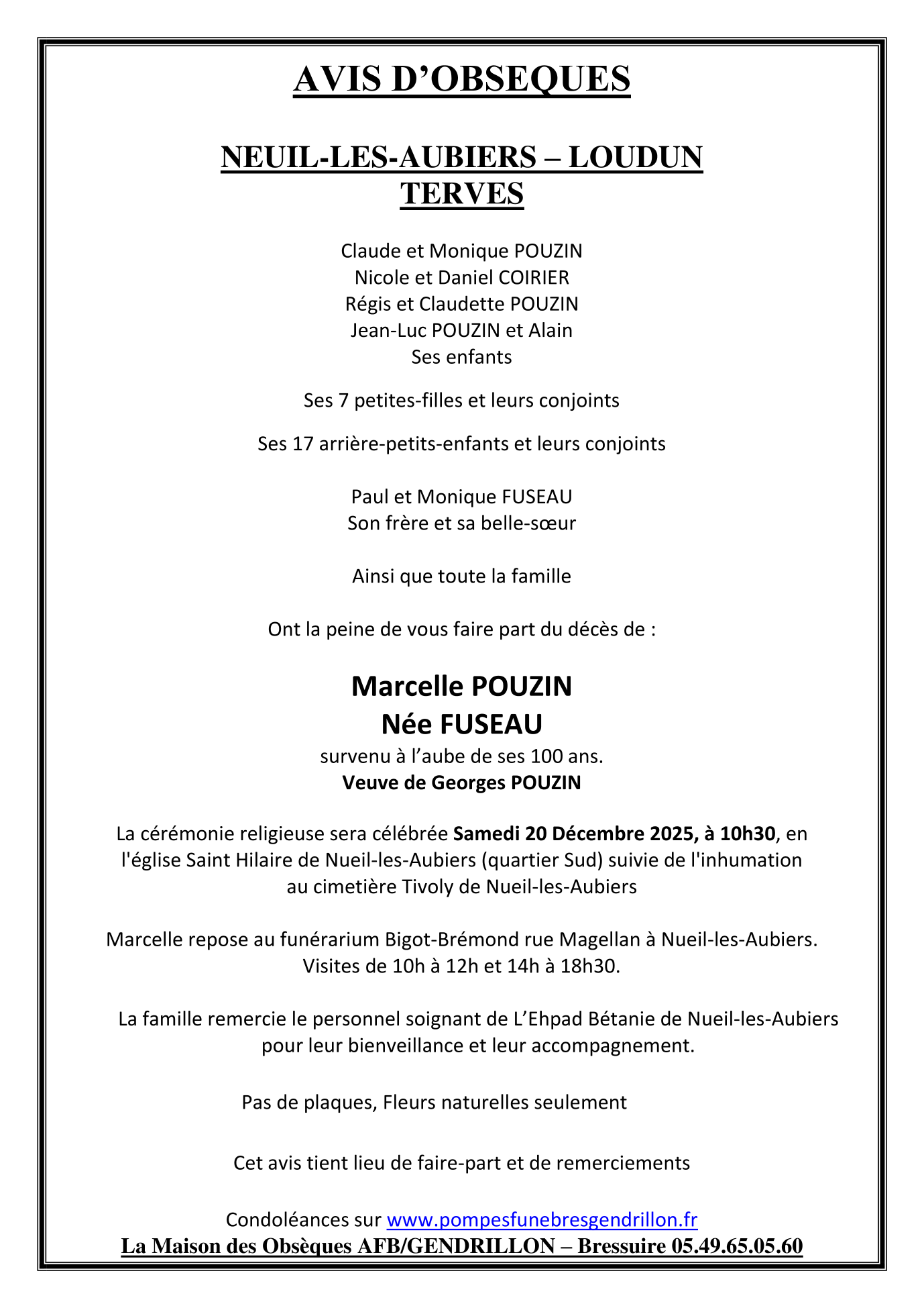 Cet espace « condoléances » est dédié à la mémoire de Madame Marcelle POUZIN née FUSEAU.