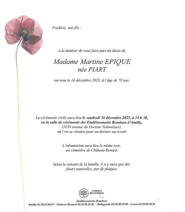 Cet espace « condoléances » est dédié à la mémoire de Madame Martine EPIQUE née PIART.