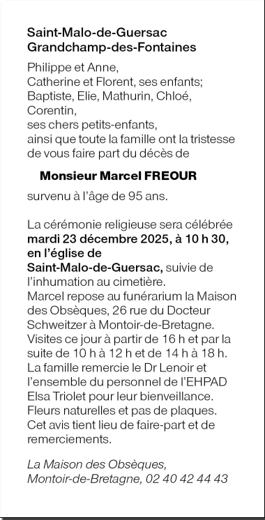 Cet espace « condoléances » est dédié à la mémoire de Monsieur Marcel FRÉOUR.