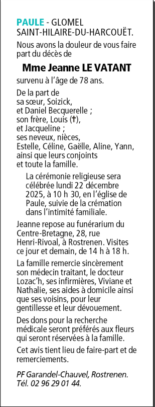 Cet espace « condoléances » est dédié à la mémoire de Madame Jeanne LE VATANT.