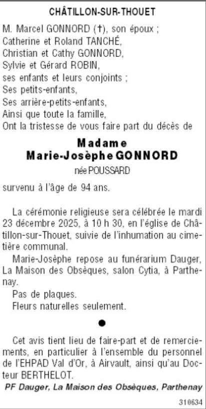 de Madame Marie-Josèphe GONNORD née POUSSARD
