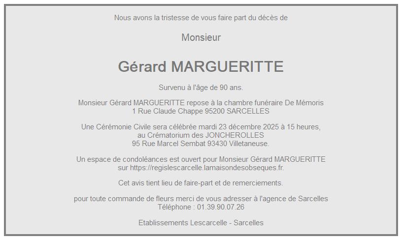 Cet espace « condoléances » est dédié à la mémoire de Monsieur Gérard MARGUERITTE.