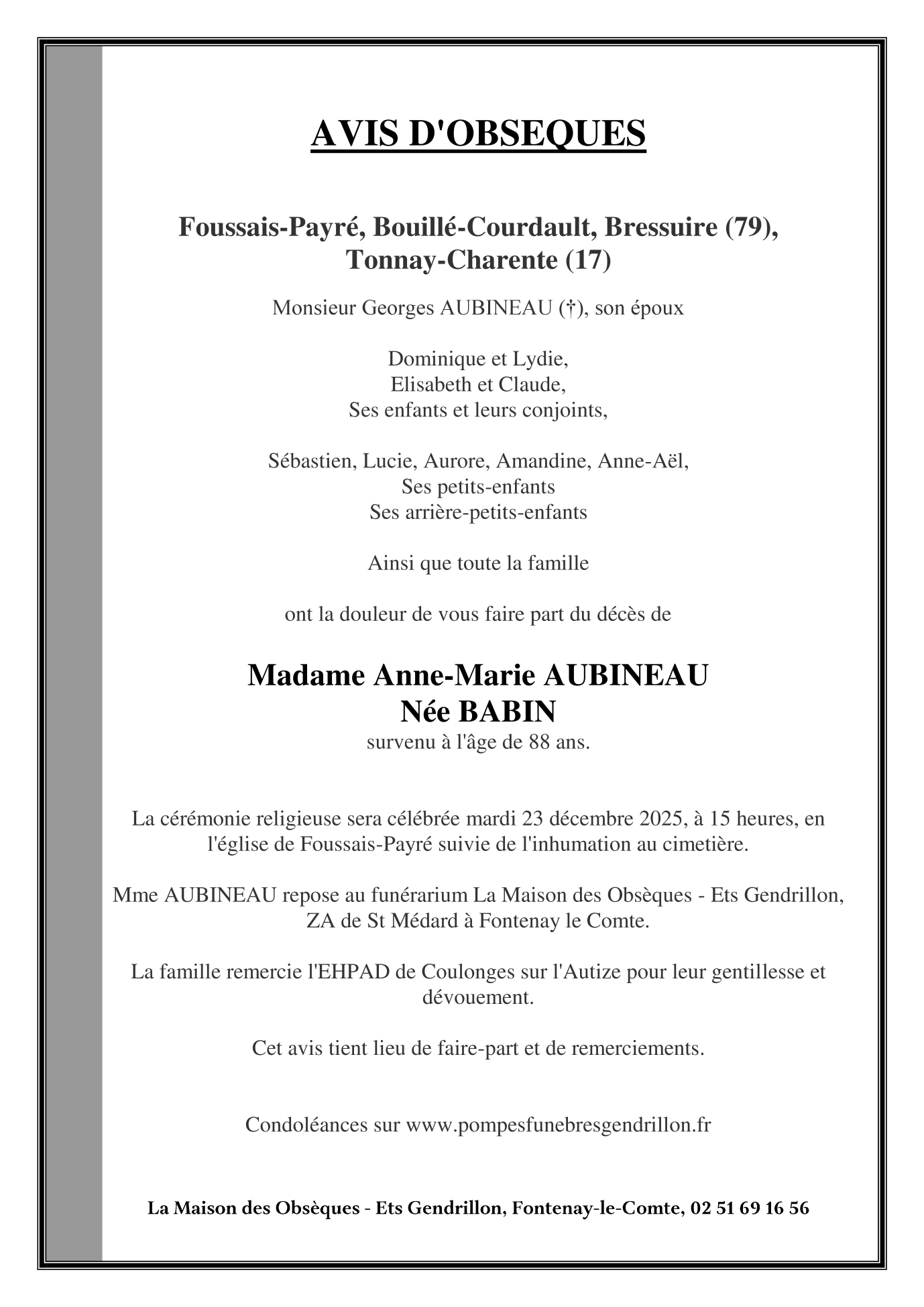 Cet espace « condoléances » est dédié à la mémoire de Madame Anne-Marie AUBINEAU née BABIN.