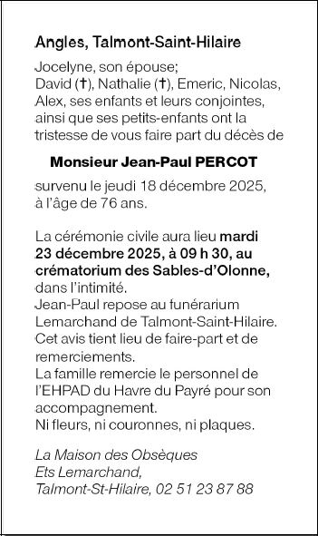 Décédé à Talmont-Saint-Hilaire (85440) le jeudi 18 décembre 2025