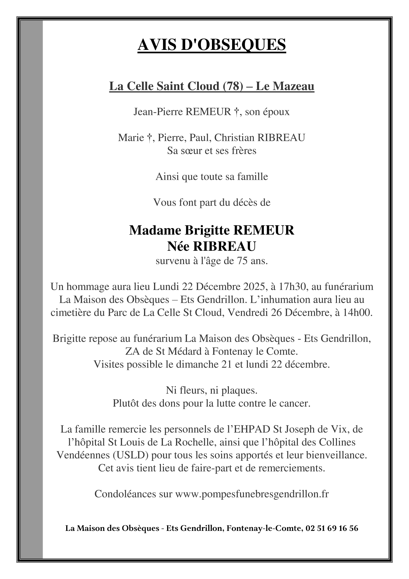 Cet espace « condoléances » est dédié à la mémoire de Madame Brigitte RÉMEUR née RIBREAU.