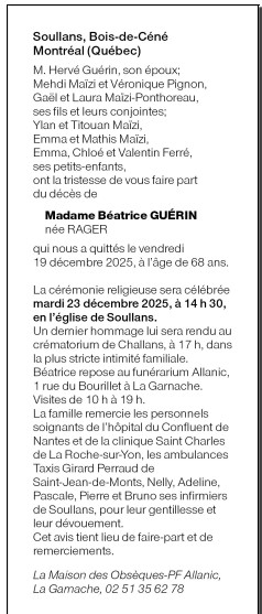 Cet espace « condoléances » est dédié à la mémoire de Madame Béatrice GUÉRIN née RAGER.