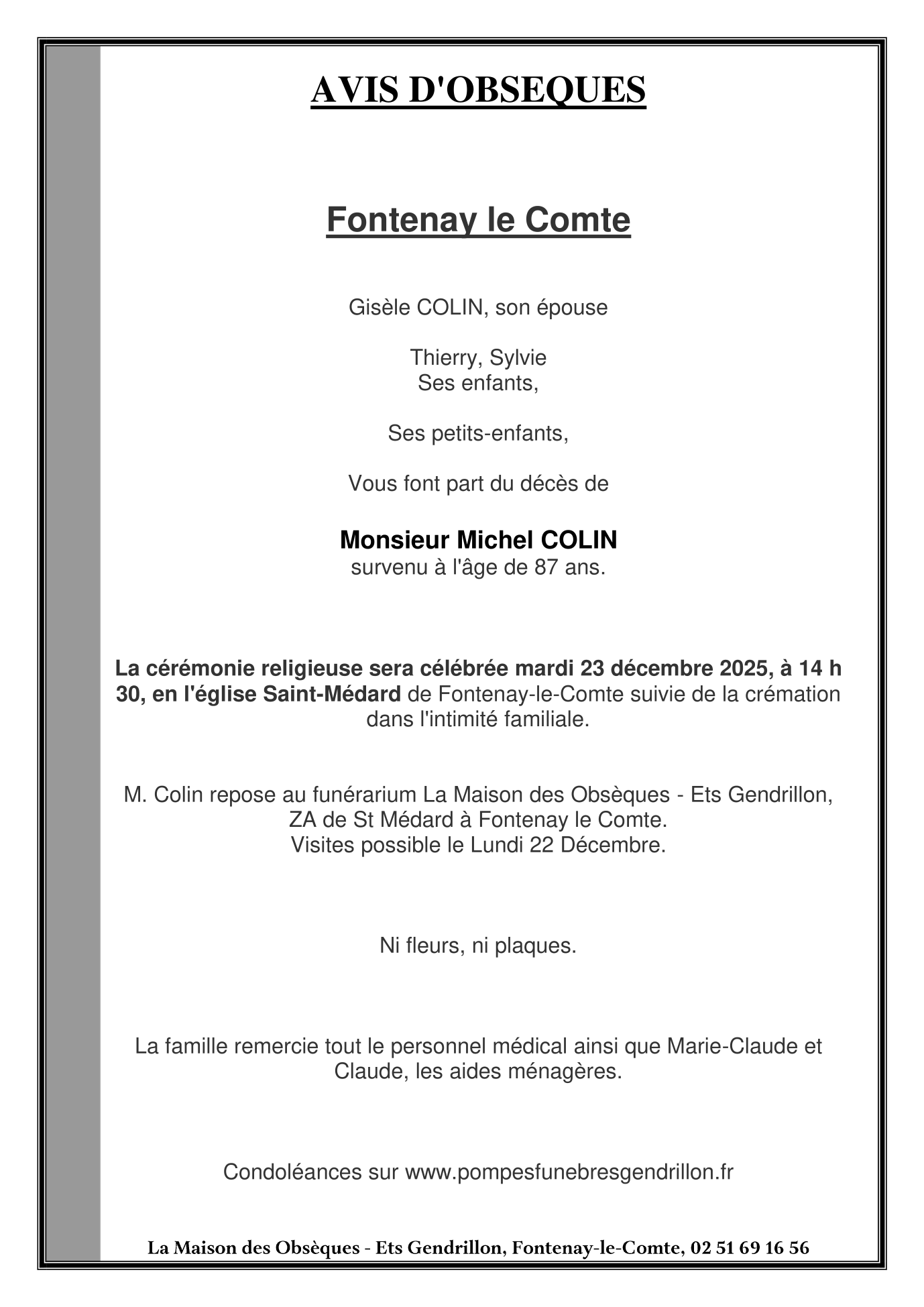 Cet espace « condoléances » est dédié à la mémoire de Monsieur Michel COLIN.